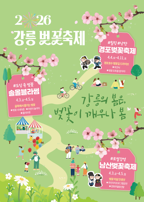 강릉벚꽃축제의 하이라이트인 경포벚꽃잔치 현장은 매년 수많은 인파가 몰리는 최고의 경포대 벚꽃 명소입니다. 2026년 경포벚꽃잔치는 개화 예상 시기인 4월 4일부터 4월 11일까지 축제 기간으로 지정되어 가장 화려한 봄의 정취를 선사합니다. 강원 벚꽃명소 중에서도 단연 으뜸으로 꼽히는 이곳은 경포호를 둘러싼 4.3km의 벚꽃 터널이 장관을 이룹니다. 경포대 벚꽃 명소만의 화사한 분위기 속에서 강원 벚꽃명소의 진면목을 발견하고 잊지 못할 2026년의 봄날을 만끽해 보세요.