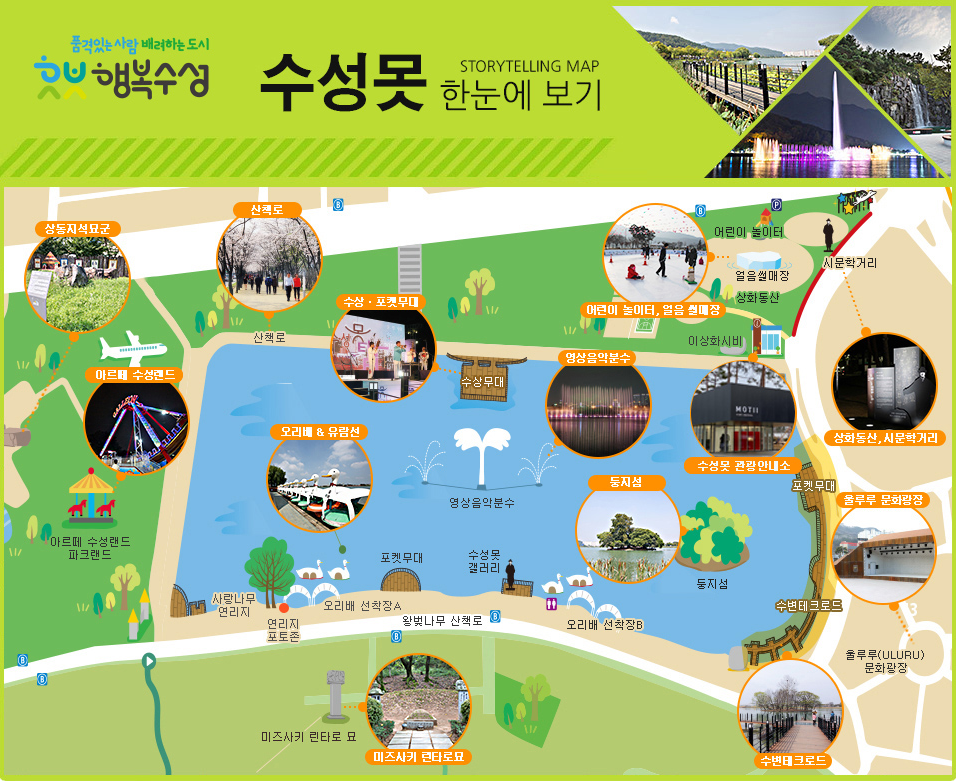 🌸 즐길 거리: 수성못 오리배 체험, 수성랜드 놀이기구, 음악 분수 관람