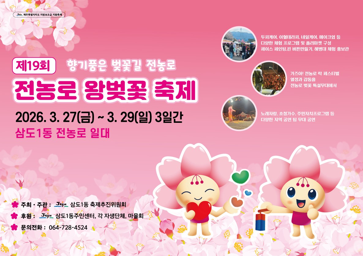 전농로는 제주시를 상징하는 유서 깊은 제주 벚꽃명소입니다. 도로 양옆의 고령 왕벚나무들이 하늘을 가릴 듯 터널을 이루는 모습은 제주도 벚꽃명소 중에서도 단연 압권입니다. 축제 기간에는 차 없는 거리가 운영되어 더욱 쾌적하게 제주 벚꽃명소를 만끽할 수 있습니다.